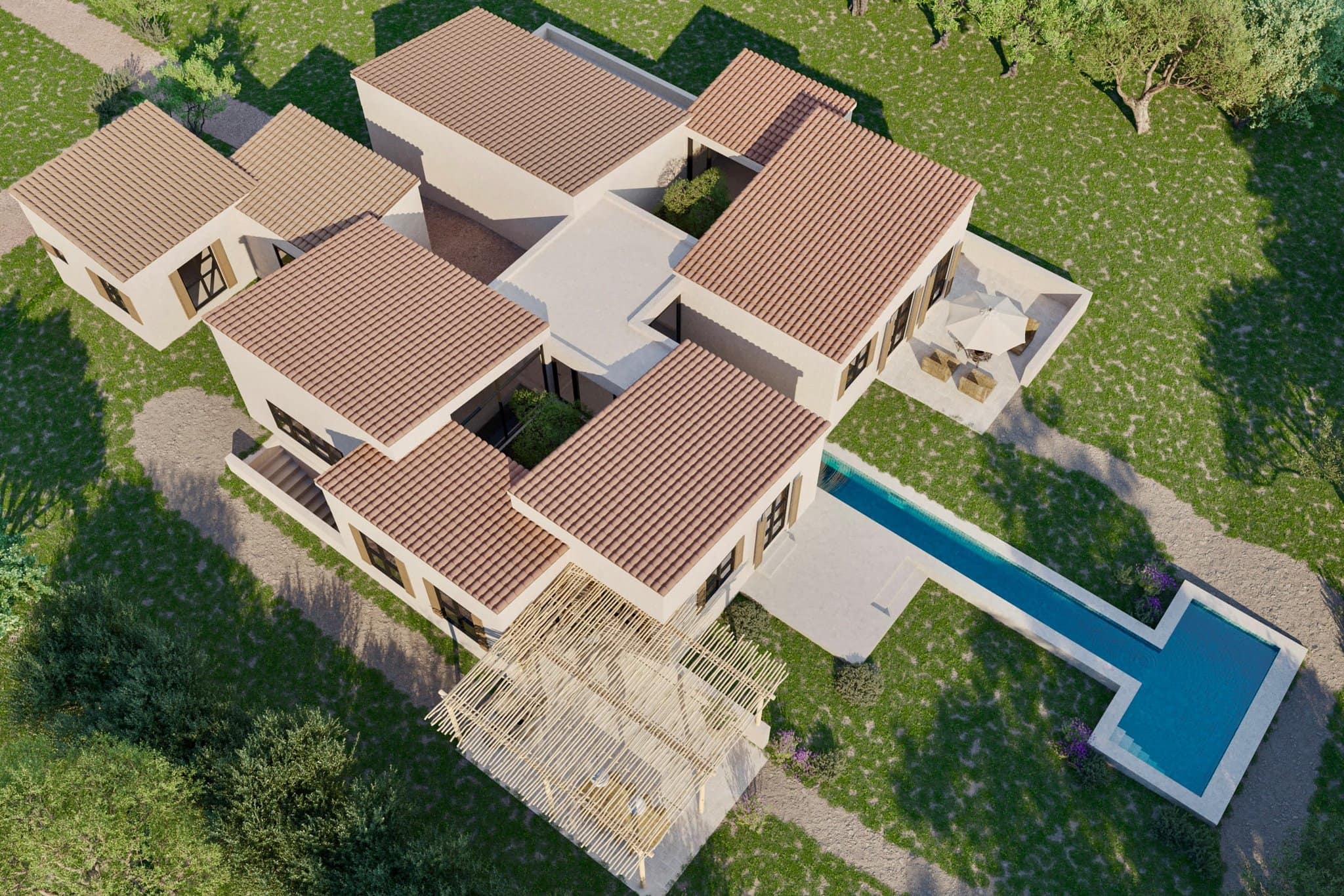 Der offen gestaltete Wohnbereich mit Designerküche, Essbereich und Salon öffnet sich direkt zur Poolterrasse – eine raumhohe Glasfront lässt Innen- und Außenraum nahtlos miteinander verschmelzen. Vier elegante Schlafzimmer mit en-suite Bädern, teils mit privaten Terrassen und gerundeten Duschen, bieten Rückzugsgelegenheiten und Stil auf höchstem Niveau. Ein weiteres Zimmer kann flexibel als Büro oder fünftes Schlafzimmer genutzt werden.