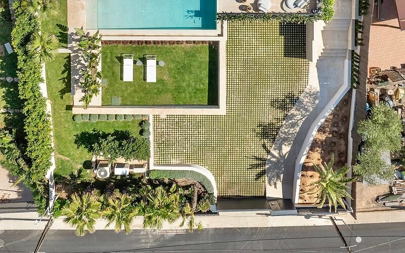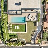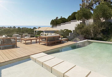 Die Außenbereiche setzen das architektonische Konzept konsequent fort. Weitläufige Terrassenflächen, ein Infinity Pool mit Blick auf das Mittelmeer und eine mediterran gestaltete Gartenlandschaft schaffen einen privaten Rückzugsort in ruhiger Umgebung. Die Südlage verleiht den Außenflächen eine besondere Qualität und macht sie ganzjährig nutzbar.