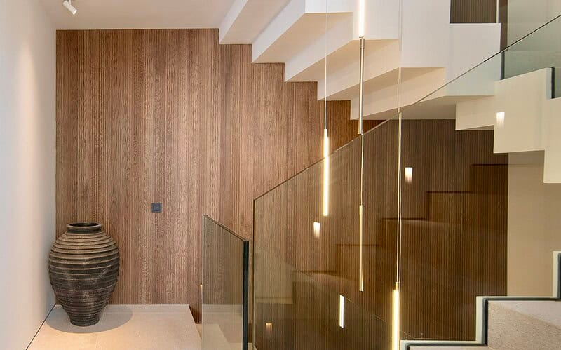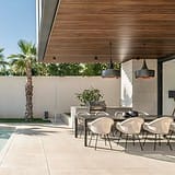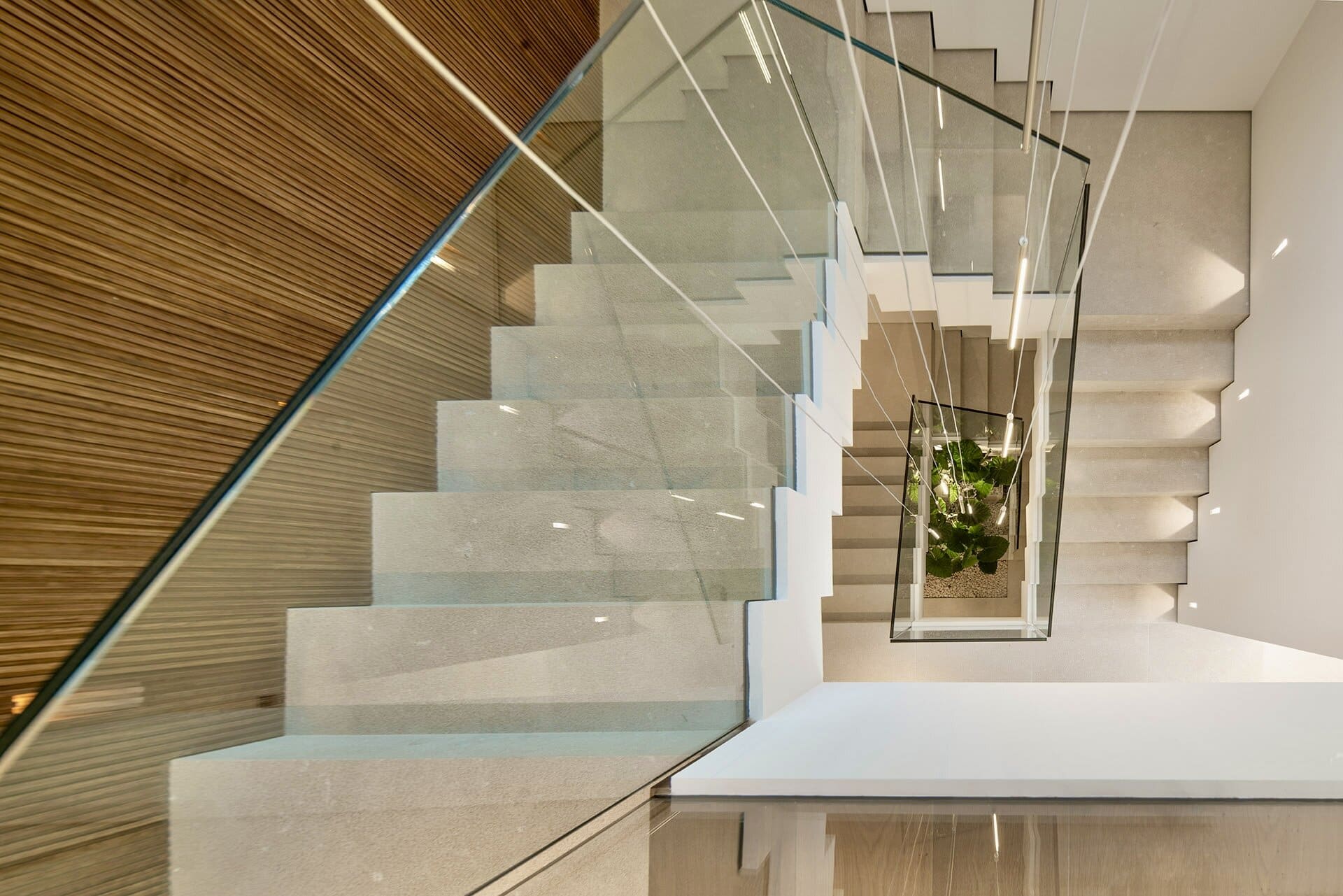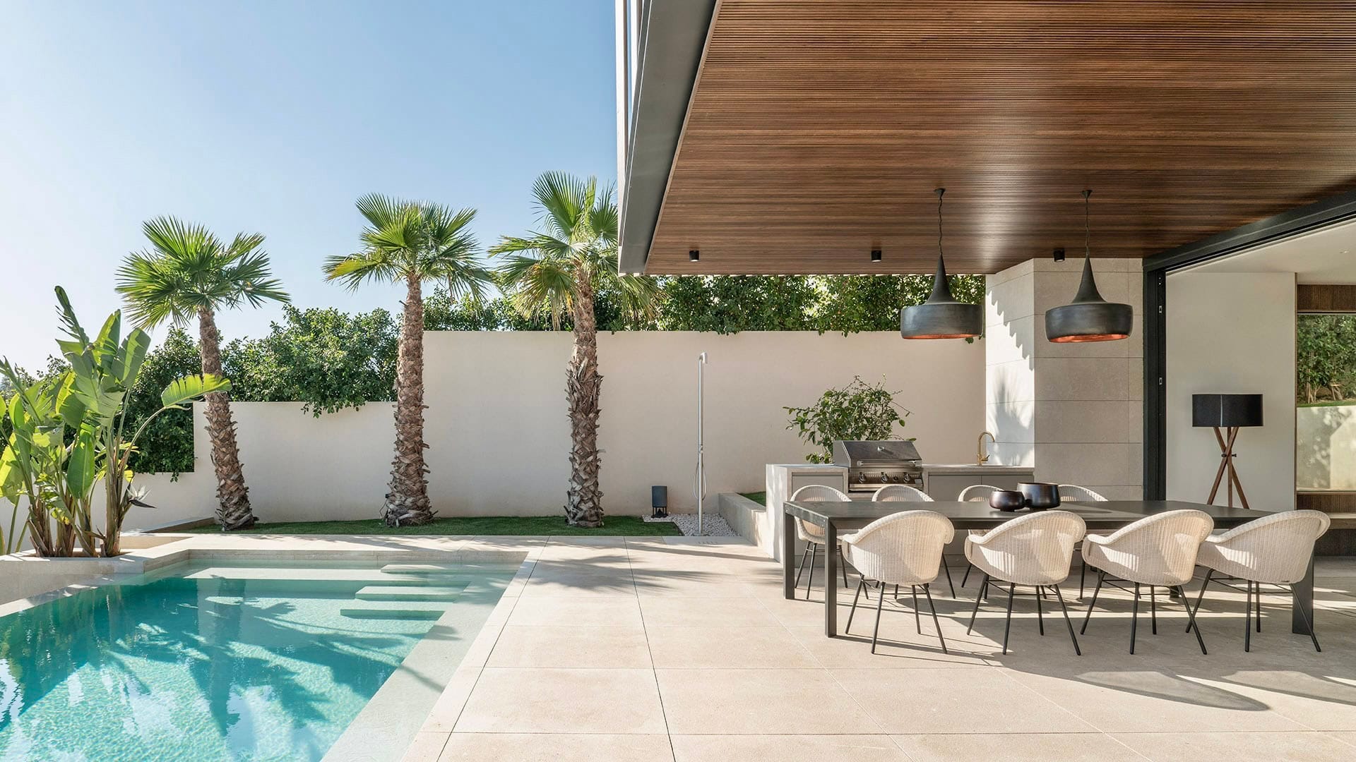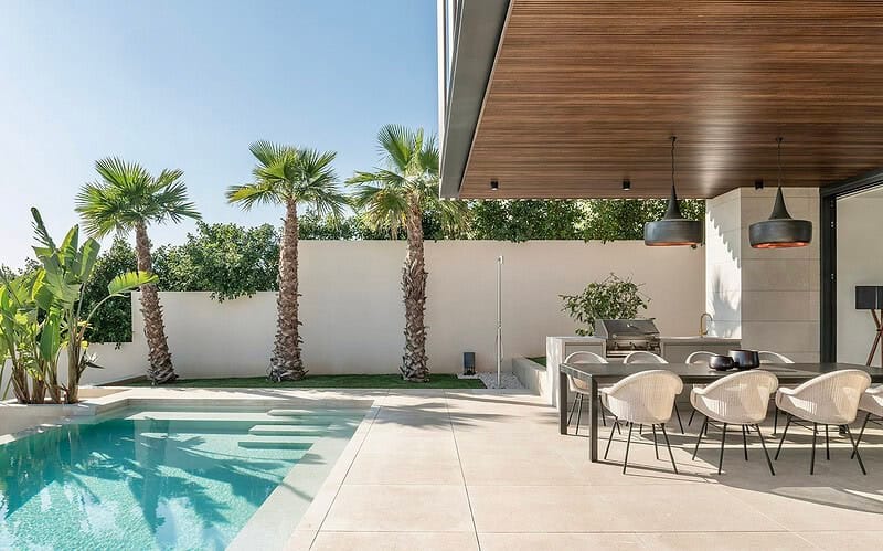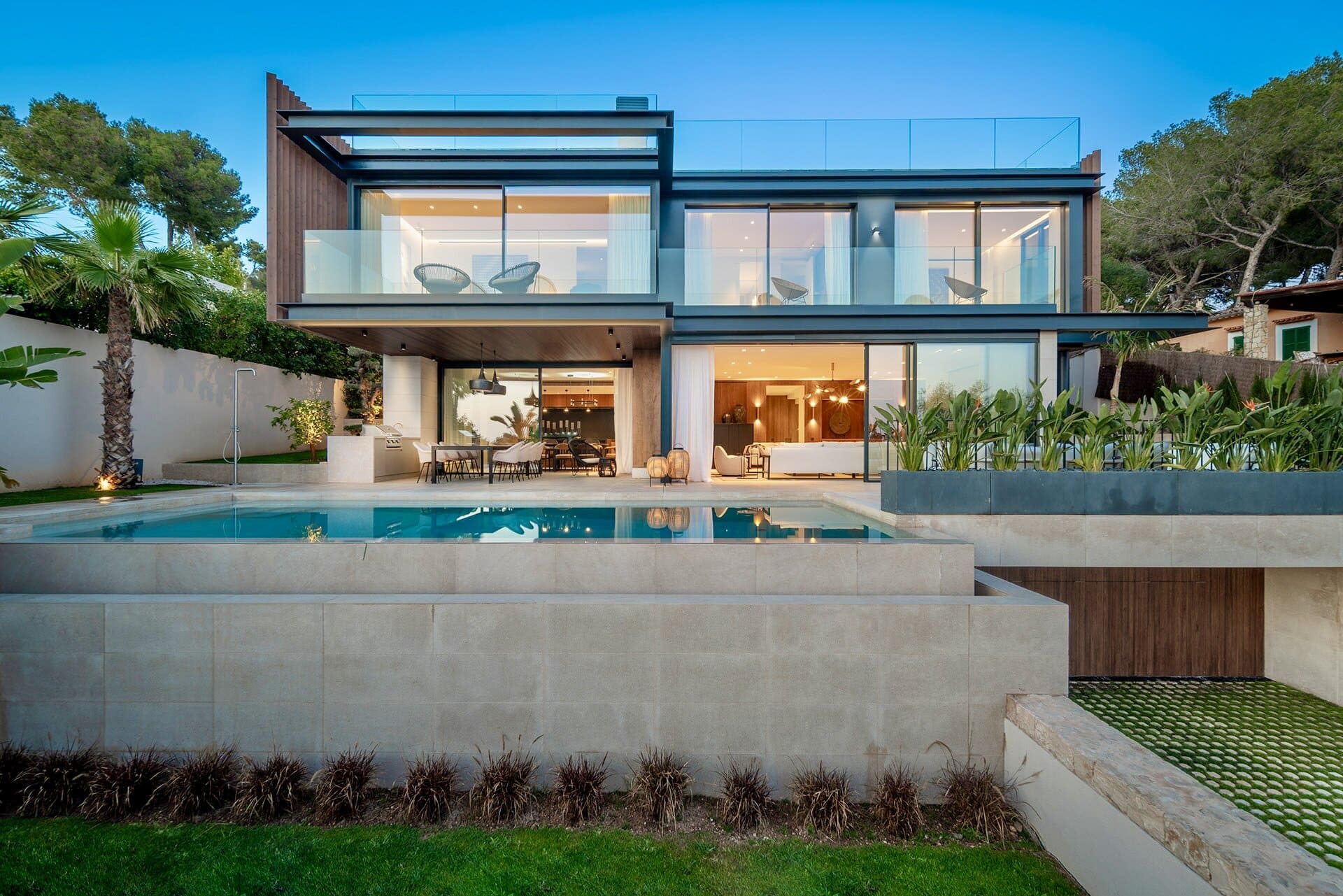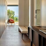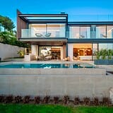 Die Architektur folgt einer klaren, modernen Formensprache mit großzügigen Glasflächen, die Innen und Außen harmonisch miteinander verbinden. Offene Wohnbereiche öffnen sich zu weitläufigen Terrassen und schaffen ein Wohngefühl, das von Weite, Licht und Ruhe geprägt ist. Die Ausrichtung nach Süden unterstreicht den mediterranen Charakter des Hauses und sorgt für helle Räume vom frühen Morgen bis in die Abendstunden.