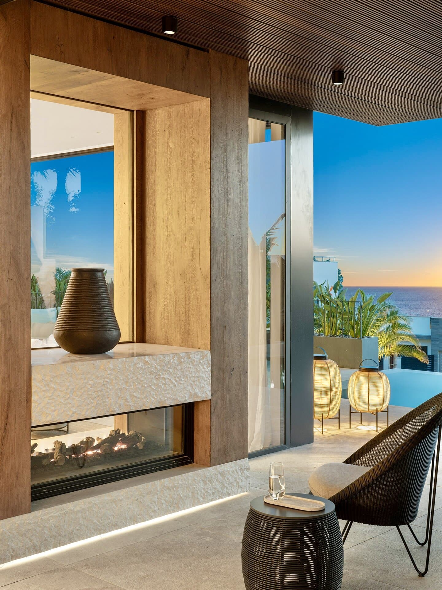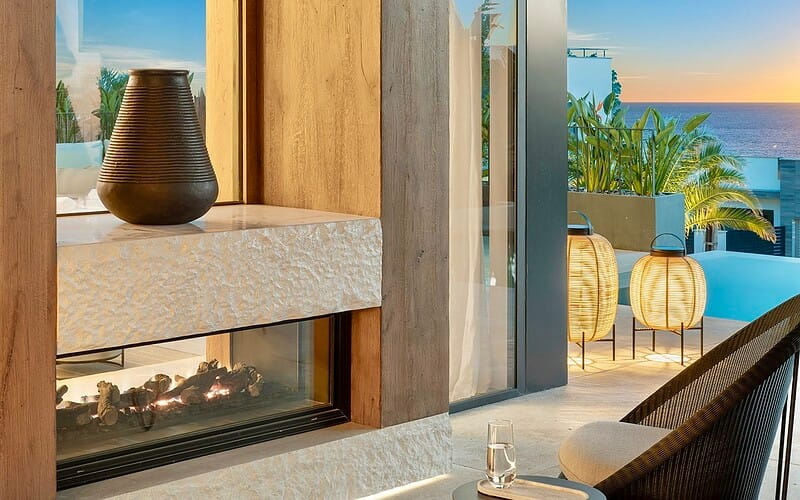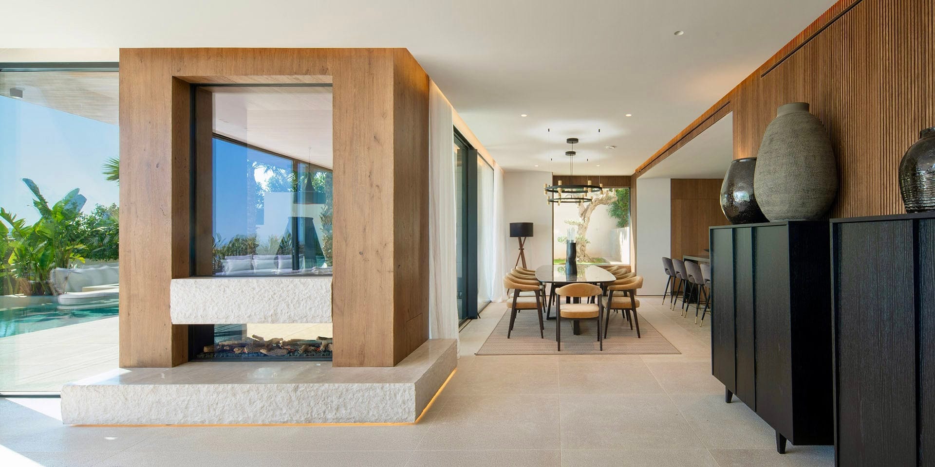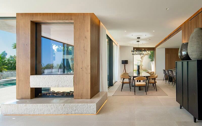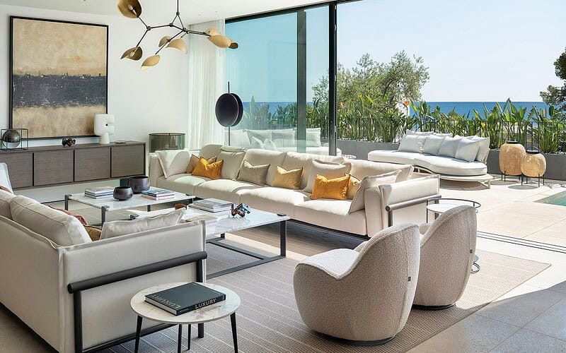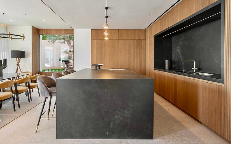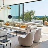 Im Inneren überzeugt die Villa durch ein durchdachtes Raumkonzept, hochwertige Materialien und eine präzise Ausführung. Naturstein, Glas und maßgefertigte Oberflächen bilden eine ruhige, zeitlose Einheit. Der offene Wohn und Essbereich mit integrierter Designküche ist auf Komfort und Geselligkeit ausgelegt und bietet durch bodentiefe Verglasungen einen direkten Bezug zum Außenraum und zum Meer.