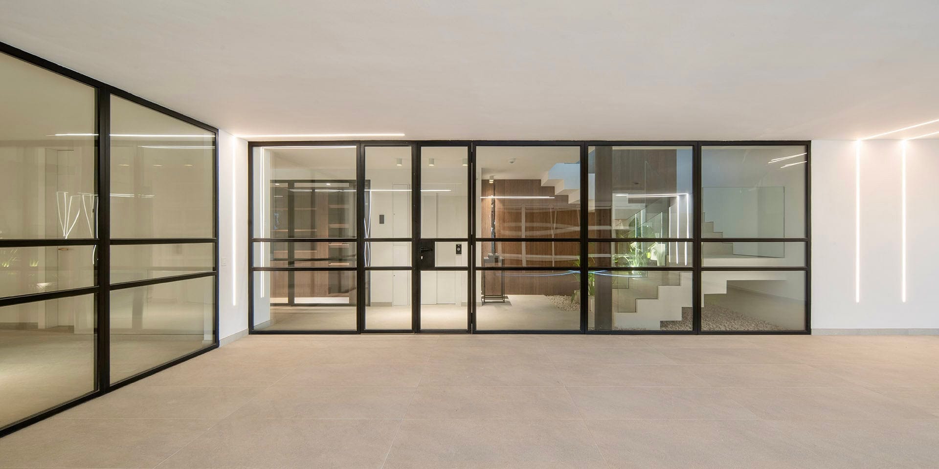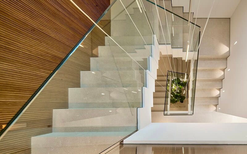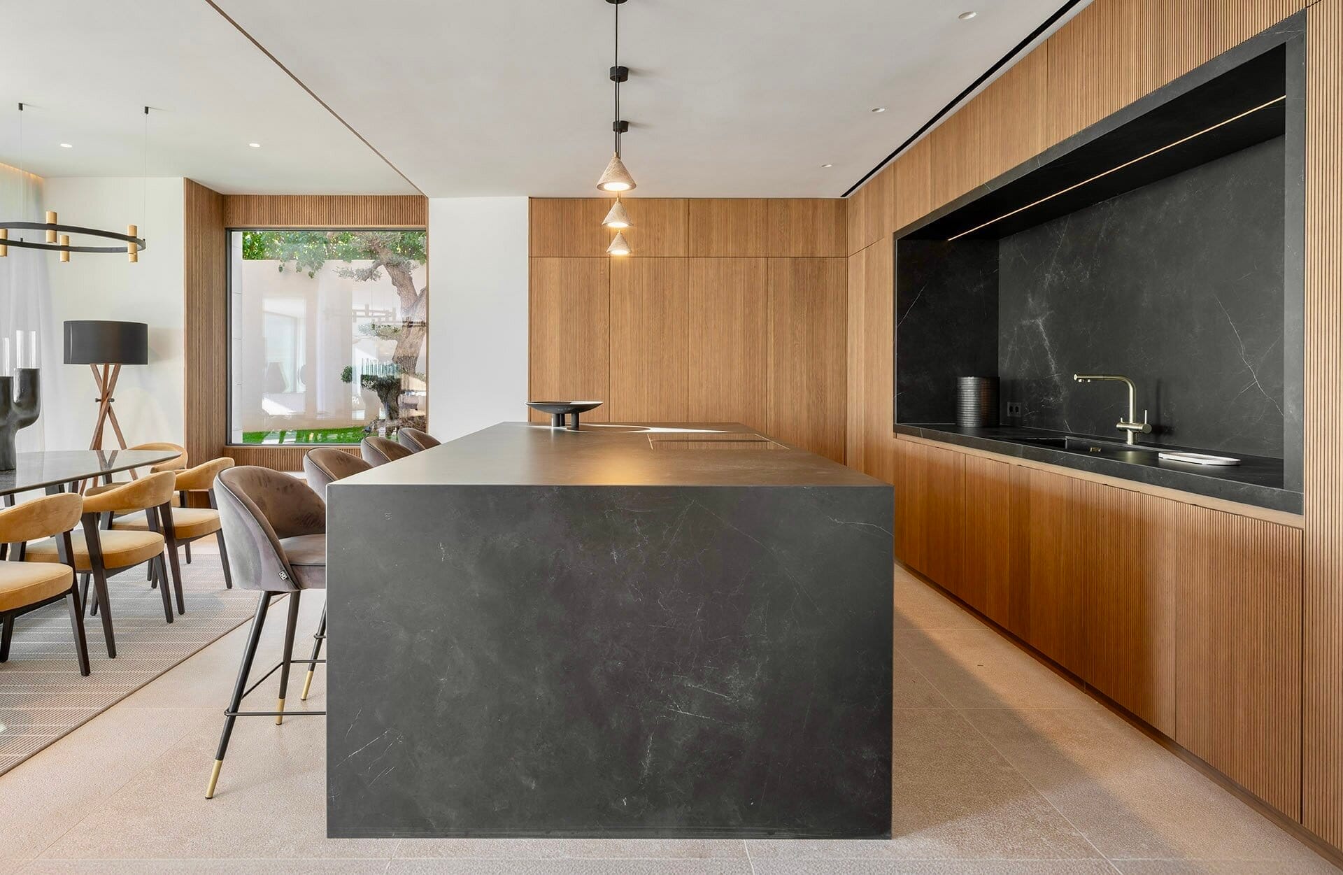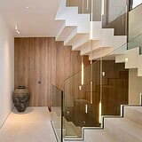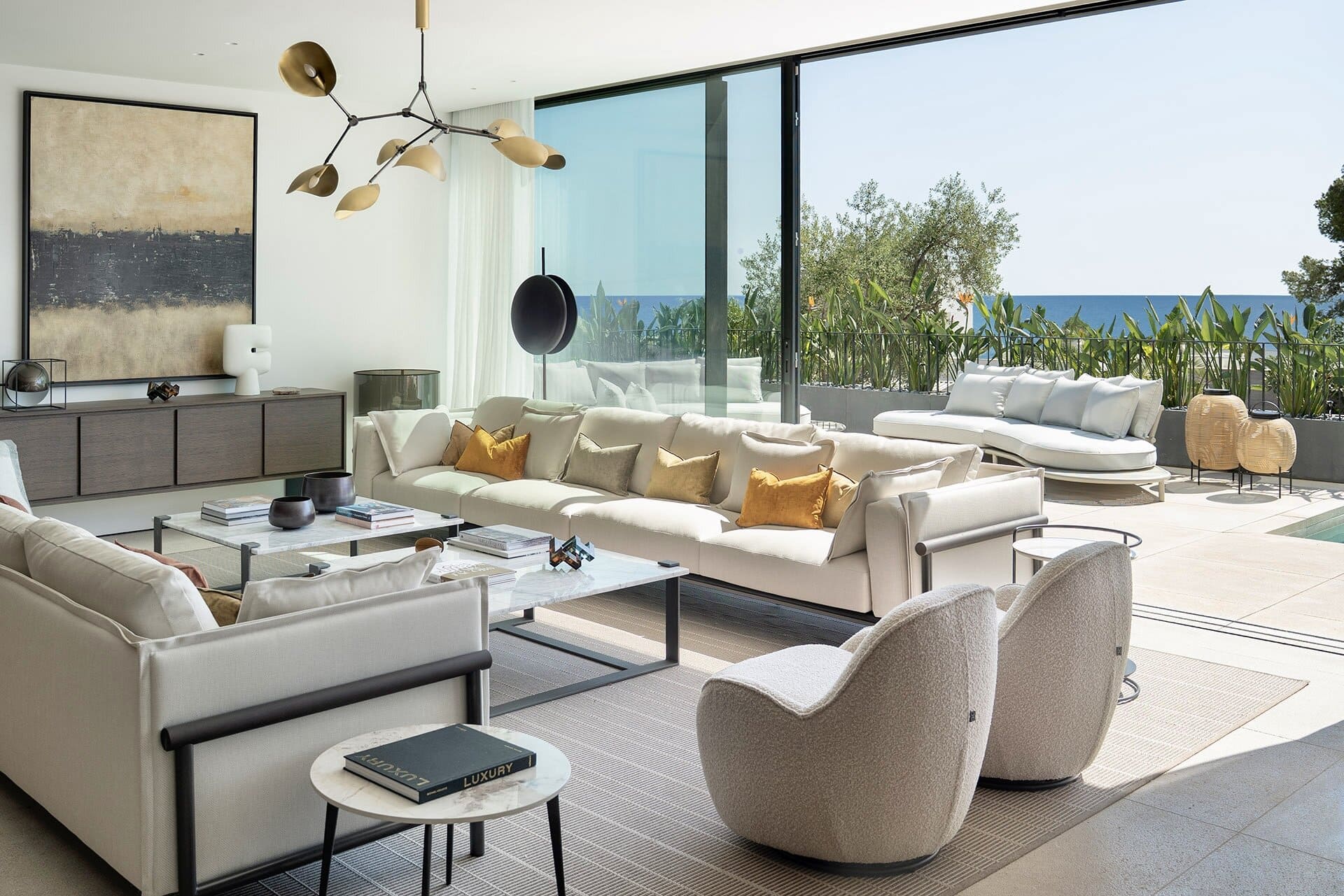 Im Inneren überzeugt die Villa durch ein durchdachtes Raumkonzept, hochwertige Materialien und eine präzise Ausführung. Naturstein, Glas und maßgefertigte Oberflächen bilden eine ruhige, zeitlose Einheit. Der offene Wohn und Essbereich mit integrierter Designküche ist auf Komfort und Geselligkeit ausgelegt und bietet durch bodentiefe Verglasungen einen direkten Bezug zum Außenraum und zum Meer.