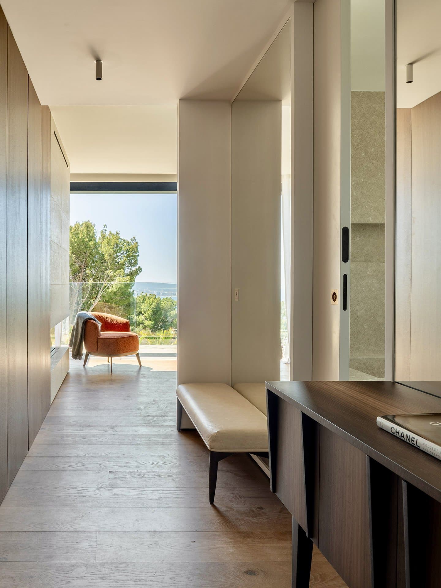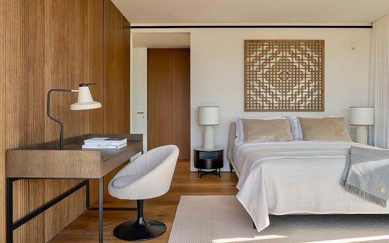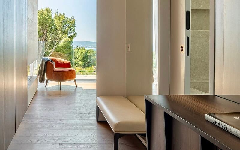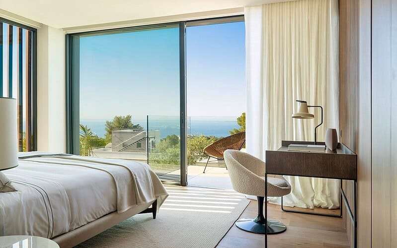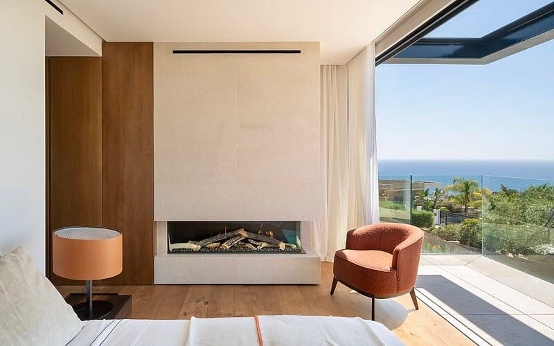 Vier großzügige Schlafzimmer mit jeweils en suite ausgestatteten Bädern bieten ein hohes Maß an Privatsphäre und Wohnqualität. Die Master Suite verfügt über eine eigene Terrasse mit Meerblick und profitiert besonders von der südlichen Ausrichtung und den langen Sonnenstunden. Jeder Raum ist klar strukturiert und auf ein elegantes, dauerhaftes Wohnerlebnis ausgelegt.