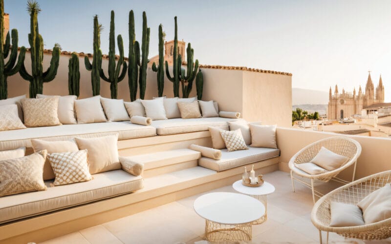 Die großzügigen 394 m² Wohnfläche verteilen sich auf ein Erdgeschoss, drei Stockwerke und eine Dachterrasse mit herrlichem Ausblick. Die insgesamt 57 m² Terrassenflächen bieten zusätzlich Raum zum Genießen der mediterranen Atmosphäre und sehr schöne Aussichten über die Altstadt von Palma.
